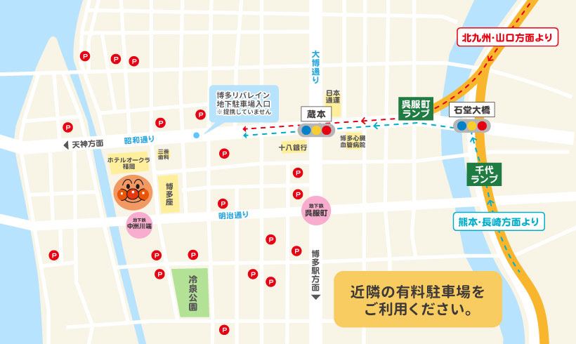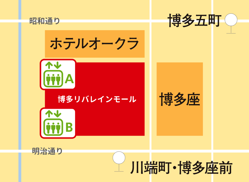 昭和通りからお越しの場合は「博多五町」が最寄りのバス停となります