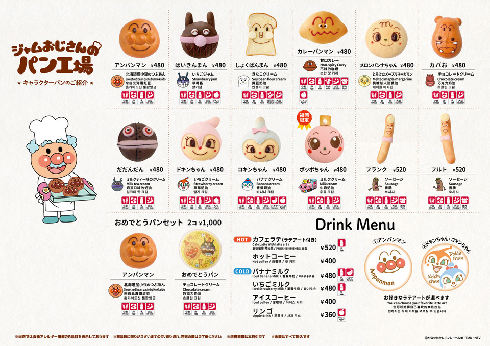 アンパンマンとなかまたちのキャラクターパンがずらり。ジャムおじさんとバタコさんが心を込めておいしいパンを作るように、ひとつひとつ丁寧にパンを作り上げる様子を間近でみることもできます。※お時間帯によっては、品切れになる可能性がございます。予めご了承くださいラストオーダー(ドリンク) ホット15:00/コールド16:00電話:092-291-8902