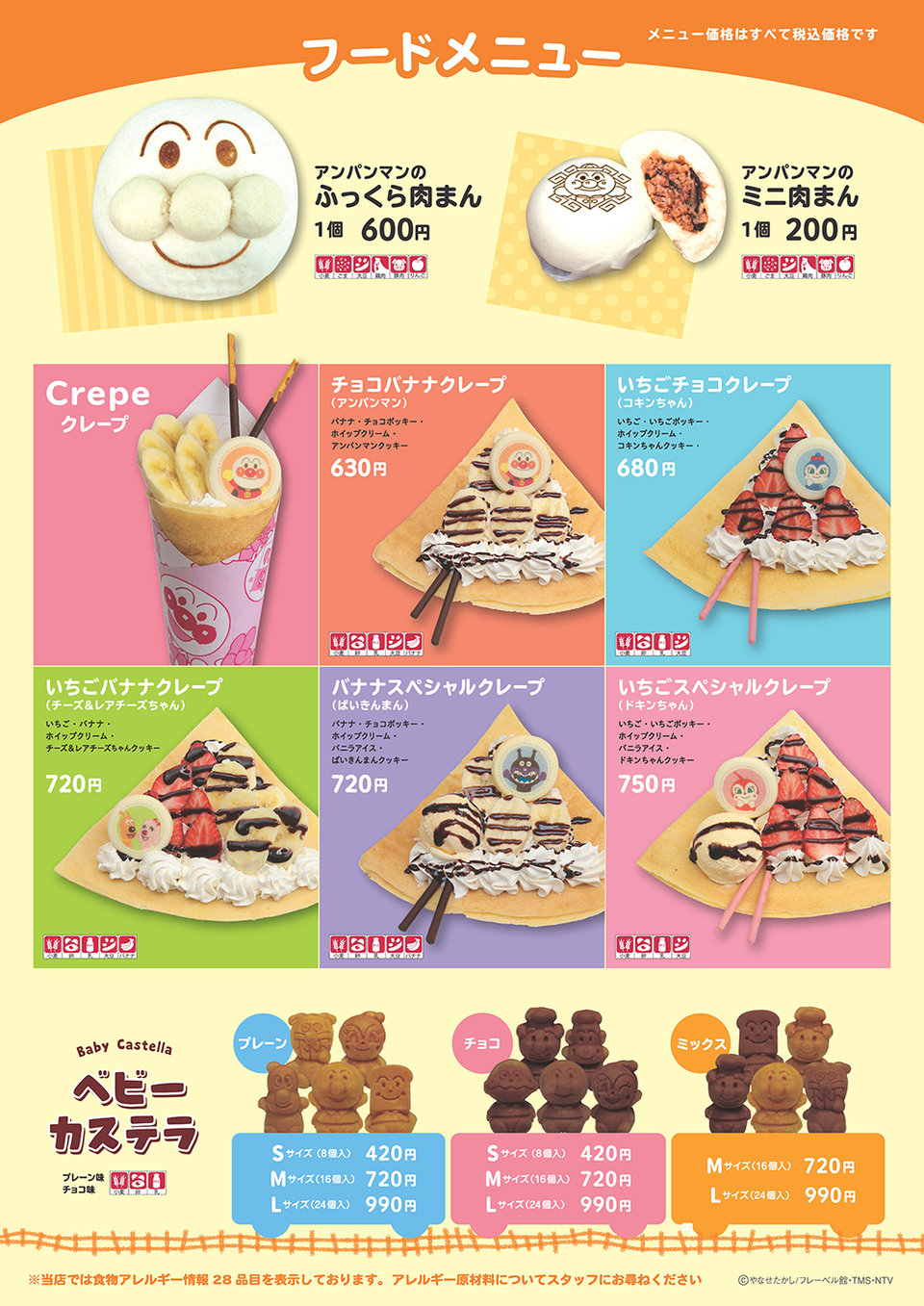 ふっくらしたアンパンマンのお顔の肉まんに、もちもち生地のクレープ。甘くてかわいいベビーカステラなど、できたてメニューを販売しています。お土産用のかわいい人形焼きやカステラ焼きもおすすめです!ラストオーダー フード 16:00/つぶつぶアイス 16:30※お土産品は閉館時間まで購入できます電話:092-291-8925
