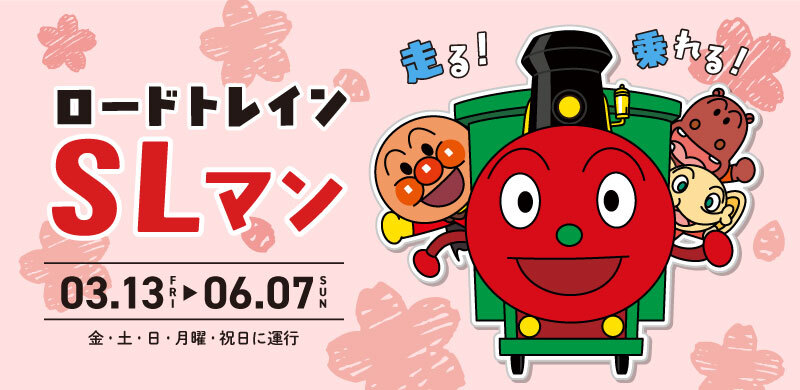 みんな大好き!「ロードトレイン SLマン」の春の運行が運行中。家族みんなで乗車してね!▷運行期間 3月13日(金)~6月7日(日)の金・土・日・月曜・祝日ほか▷運行時間 10:30~16:30▷乗車方法 入場後に時間が指定された乗車券をお受取ください。※乗車券の配布は無くなり次第終了しますくわしくはこちら